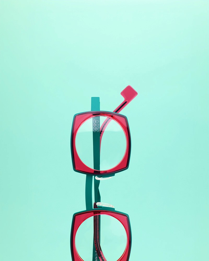 La collection explore la rencontre entre légèreté et contraste, où l’acétate translucide et coloré se mêle au métal, laissant passer la lumière et révélant des reflets changeants.